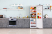 Otwórz dużą lodówkę z produktami we wnętrzu kuchni