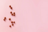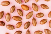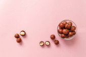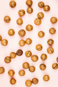 Surowe orzechy makadamia nieobrane na różowym tle.