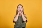 Zdjęcie "Młoda, zabawna pani w ładnej koszuli nadyma policzki i trzyma palce" może być wykorzystywane do celów osobistych i komercyjnych zgodnie z warunkami zakupionej licencji Royalty-free. Obraz jest dostępny do pobrania w jakości wysokiej rozdzielczości do 5760x3840.
