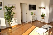 Panorama jasnej recepcji i poczekalni w klinice z biurkiem, nowoczesnymi krzesłami i roślinami. Indoor makieta z ekranem z miejsca do kopiowania.