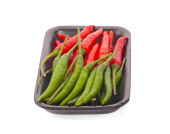 kupie pieprz czerwony gorący chillie w czarny pojemnik na białym tle na wh