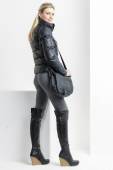 portret kobiety stojącej w czarne ubrania z torebki
