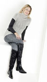 kobieta siedzi na sobie czarne ubrania i buty z torebki