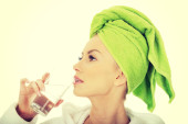 dziewczyna z ręcznikiem na głowie rąk szklankę wody