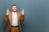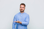 Zdjęcie "młody przystojny biznesmen patrząc podekscytowany i zaskoczony wskazując na bok i w górę, aby skopiować przestrzeń na płaskim tle" może być wykorzystywane do celów osobistych i komercyjnych zgodnie z warunkami zakupionej licencji Royalty-free. Obraz jest dostępny do pobrania w jakości wysokiej rozdzielczości do 5760x3840.