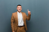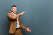 młody przystojny biznesmen patrząc podekscytowany i zaskoczony wskazując na bok i w górę, aby skopiować przestrzeń na płaskim tle