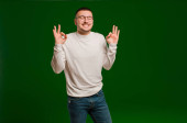 młody przystojny mężczyzna wygląda poważnie i krzyż z palcem przyciśnięty do ust wymagających ciszy lub spokoju, utrzymanie tajemnicy na płaskim tle