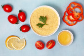 Różne niegotowane makarony z produktami na białym tle
