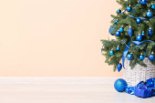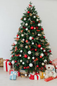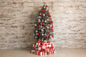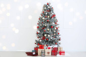 Ozdobiona choinka i prezenty w pobliżu ściany światła