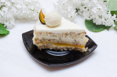 wielowarstwowe piękne ciasto z białą śmietaną i czerwonymi porzeczkami, na białym talerzu, deser porcja