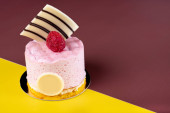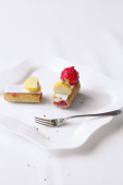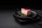 wielowarstwowe piękne ciasto z białą śmietaną i czerwonymi porzeczkami, na białym talerzu, deser porcja
