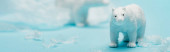 Zdjęcie panoramiczne zabawek niedźwiedzi polarnych z polietylenu i plastiku na niebieskim tle, koncepcja dobrostanu zwierząt