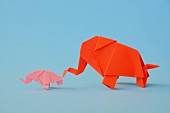 Białe zabawki hipopotama i nosorożca z plastikowymi odpadami na niebieskim tle, koncepcja dobrostanu zwierząt