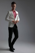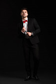 stylowy mężczyzna w garniturze i muszce stojący z ręką w kieszeni na szarym