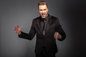przystojny mężczyzna śpiew podczas dotykając mikrofon odizolowany na szary