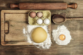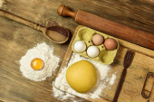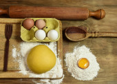 Bułka z makaronem jajecznym, ze składnikami na stole.
