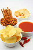 Talerz ze smacznymi chipsami ziemniaczanymi, pomidorami i przyprawami na stole