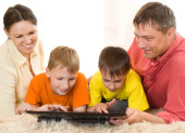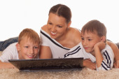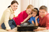 Rodzina leży na dywanie z laptopa