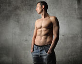 mięśnie silny piękny stripped mężczyzna model z czarny t-shirt w dżinsy niebieski na czarny odizolowane czcionki tło