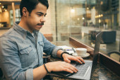 Zdjęcie "Facet korzystający z laptopa w kawiarni" może być wykorzystywane do celów osobistych i komercyjnych zgodnie z warunkami zakupionej licencji Royalty-free. Obraz jest dostępny do pobrania w jakości wysokiej rozdzielczości do 5760x3840.