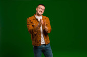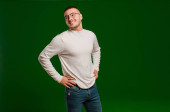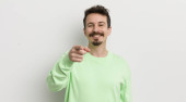 młody przystojny mężczyzna uśmiechnięty, pewny siebie, odnoszący sukcesy i szczęśliwy, pokazujący koncepcję lub pomysł na przestrzeń do kopiowania na płaskim tle