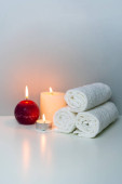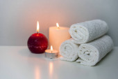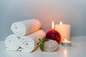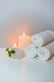 Zabieg spa w salonie pionowa koncepcja zdjęcie na szarym tle z stosem białych ręczników, świece i filiżanka soli morskiej.