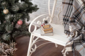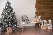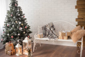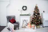 Choinka z prezentami pod spodem w salonie. Biały pokój. Jasne światła i bokeh.