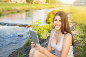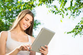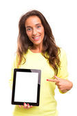 atrakcyjny dorywczo młoda kobieta pokazano komputera typu tablet i kciuka
