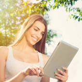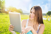 Zdjęcie "atrakcyjny dorywczo młoda kobieta pokazano komputera typu tablet i kciuka" może być wykorzystywane do celów osobistych i komercyjnych zgodnie z warunkami zakupionej licencji Royalty-free. Obraz jest dostępny do pobrania w jakości wysokiej rozdzielczości do 5760x3840.