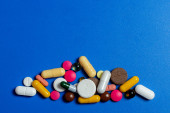 Zdjęcie "Zbliżenie różnych wielobarwnych tabletek na niebieskim tle. Leczenie płaskie." może być wykorzystywane do celów osobistych i komercyjnych zgodnie z warunkami zakupionej licencji Royalty-free. Obraz jest dostępny do pobrania w jakości wysokiej rozdzielczości do 5760x3840.