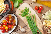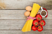 Makaron, pomidory i zioła. Składniki do gotowania na drewnianym stole. Widok z góry z przestrzenią kopiowania. Płaski lay