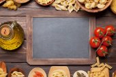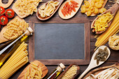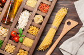 Różne makarony w drewnianym pudełku. Widok z góry płaski leżał z miejsca kopiowania