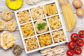 Zdjęcie "Różne makarony w drewnianym pudełku. Widok z góry płaski leżał z miejsca kopiowania" może być wykorzystywane do celów osobistych i komercyjnych zgodnie z warunkami zakupionej licencji Royalty-free. Obraz jest dostępny do pobrania w jakości wysokiej rozdzielczości do 5760x3840.