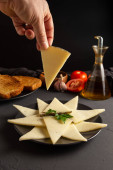 Kawałki sera na czarnym tle. Przestrzeń kopiowania