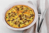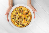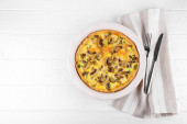Ciasto ze szpinakiem, wiśnią i mozzarellą. Zbliżenie. Koncepcja pysznego jedzenia, przepisy kulinarne.