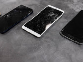 Mężczyzna trzymający komórkę po wypadku. Telefon cyfrowy z zepsutym ekranem.