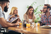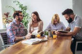 Wesoła młodzież spożywa posiłek siedząc przy kolacji