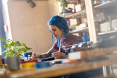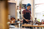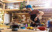 Zdjęcie "Pewna siebie młoda rzemieślniczka w swoim warsztacie" może być wykorzystywane do celów osobistych i komercyjnych zgodnie z warunkami zakupionej licencji Royalty-free. Obraz jest dostępny do pobrania w jakości wysokiej rozdzielczości do 5760x3840.