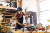 Pewna siebie młoda rzemieślniczka w swoim warsztacie