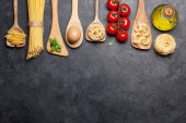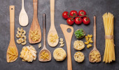 Zdjęcie "Różne makarony w łyżeczkach i składników gotowania. Widok z góry płaski leżał z miejsca kopiowania" może być wykorzystywane do celów osobistych i komercyjnych zgodnie z warunkami zakupionej licencji Royalty-free. Obraz jest dostępny do pobrania w jakości wysokiej rozdzielczości do 5760x3840.