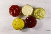 Zdjęcie "Zestaw sosów na białym drewnianym stole" może być wykorzystywane do celów osobistych i komercyjnych zgodnie z warunkami zakupionej licencji Royalty-free. Obraz jest dostępny do pobrania w jakości wysokiej rozdzielczości do 5760x3840.