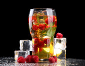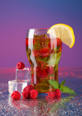 mrożonej herbaty z malin i mięta na ciemnym tle światło żółty