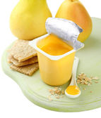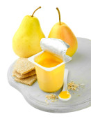 smaczny deser w otwartych plastikowy kubek i banana, na białym tle