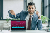 widok z boku uśmiechnięty dwurasowy handlowiec pokazując tak gest i siedzi w pobliżu komputerów