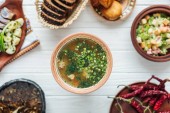 widok z góry pho w misce w pobliżu limonki, chili i kolendry na białym tle