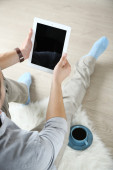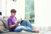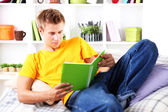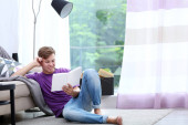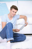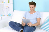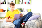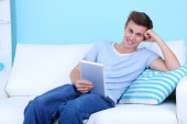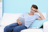 młody człowiek na kanapie z tabletka