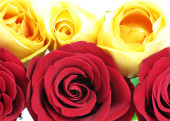 kolor czerwony, żółty i brzoskwiniowy róż z czarnym bac