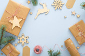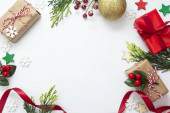 Zdjęcie z czerwoną kopertą, ciasteczka, gałązki świerkowych dekoracji świątecznych.
