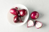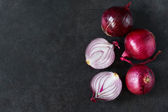 Czerwona cebula. Całe i pokrojone cebule. Czarne tło. Układy płaskie.