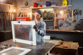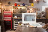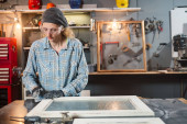 Stolarz pracujący nad starym drewnem w warsztacie retro vintage.